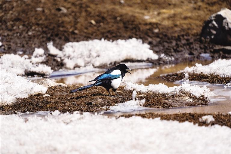 山谷內(nèi),牦牛悠然自得地吃著草,彎曲的小河縱向穿過(guò)草甸,河面還覆蓋著半邊冰殼,活水從豁口涌出,推著碎冰碴子旋轉(zhuǎn),撞擊在冰沿上發(fā)出清脆的聲響。潺潺流水聲、牛叫聲與鳥(niǎo)類(lèi)的鳴啼交織在一起,奏響了一曲治愈的鄉(xiāng)村小調(diào)。