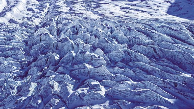 冰川突兀地橫亙?cè)谏焦戎?,斷裂面閃爍著冷白的光芒。冰舌邊緣布滿(mǎn)裂痕,表層泛著松石般的色澤,陰影處則沉淀成深邃的藍(lán)色。微風(fēng)拂過(guò)冰面,一股清冷又帶著泥土芬芳的氣息撲面而來(lái)。