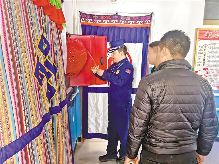 林芝市工布江達縣消防救援大隊宣傳人員檢查養(yǎng)老機構(gòu)的消防設(shè)施設(shè)備。通訊員 才旺多吉 攝