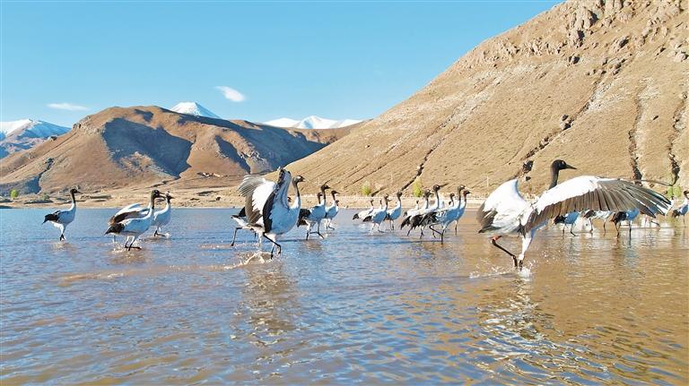 黑頸鶴在林周縣卡孜水庫嬉戲。