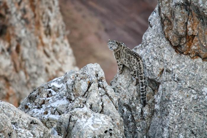 青海省玉樹藏族自治州境內(nèi),一只雪豹在山崖間眺望。 玉樹藏族自治州官方供圖