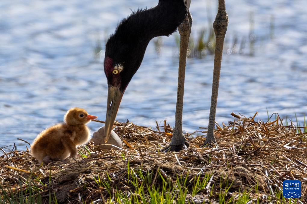 6月5日,一只黑頸鶴在那曲市申扎縣的濕地上照顧前一天剛出殼的雛鳥。新華社記者 姜帆 攝