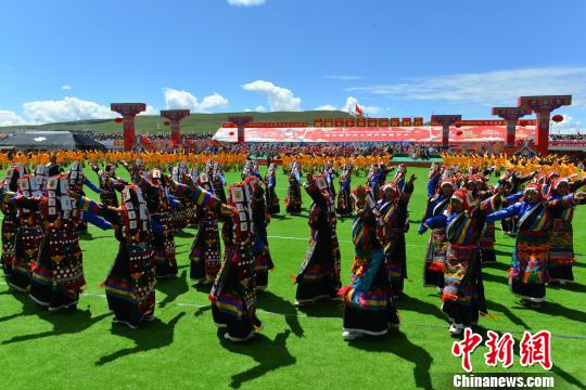 2019年8月10日,西藏那曲牧民參加一年一度的賽馬節(jié)。圖為當(dāng)?shù)嘏越M成的大型鍋莊舞團隊在開幕式上進行表演。(資料圖) 江飛波 攝
