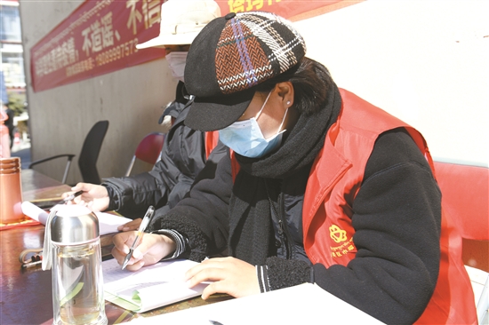 為大學生志愿者次仁措姆在塔瑪小區(qū)門口幫小區(qū)物業(yè)登記出入人員信息。(本組圖片由拉薩融媒視覺組攝)