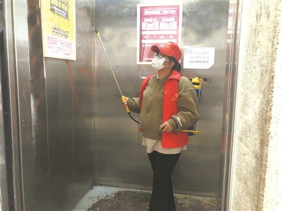 為大學生志愿者拉姆在城關花園A區(qū)電梯內噴灑消毒液。(本組圖片由拉薩融媒視覺組攝)