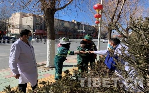 圖為次仁向環(huán)衛(wèi)綠化工人贈(zèng)送“九味防瘟香囊”