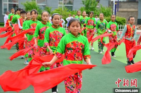 圖為化隆縣第一小學(xué)的學(xué)生們正在跳《民族大團(tuán)結(jié)》(左前一是李貴蘭)。 魯?shù)り?攝