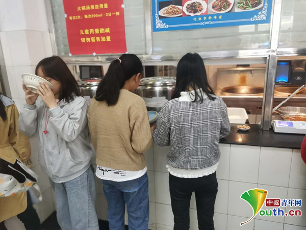 圖為學生正在領取“大鍋湯”。中國青年網(wǎng)通訊員 廖旭 攝