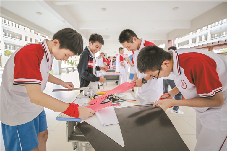 圖為當(dāng)日,北京師范大學(xué)??诟綄賹W(xué)校的學(xué)生制作彈珠滑軌。新華社記者 張麗蕓攝