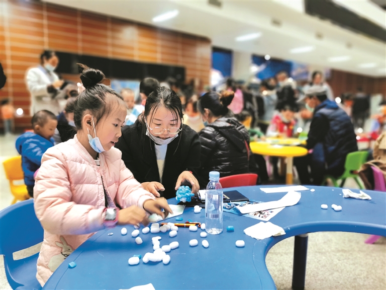 圖為市民帶著孩子參加親子活動,一起動手制作海洋生物。拉姆次仁攝