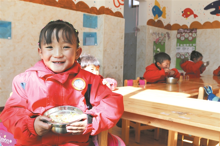 圖為白朗村幼兒園的學生在吃午餐。 龍俊霖攝