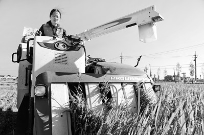 江蘇省太倉市璜涇鎮(zhèn)雅豐農(nóng)場,農(nóng)業(yè)委培大學(xué)生范盈丹駕駛收割機(jī)在稻田間收割水稻。計(jì)海新攝/光明圖片