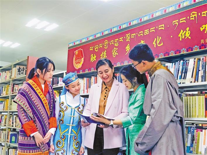 圖為共青團(tuán)西藏自治區(qū)委員會(huì)副書記格桑卓瑪(左三)向武漢西藏中學(xué)的學(xué)生們介紹“觸摸家鄉(xiāng)變化·傾聽黨的聲音”主題書刊。央金 攝