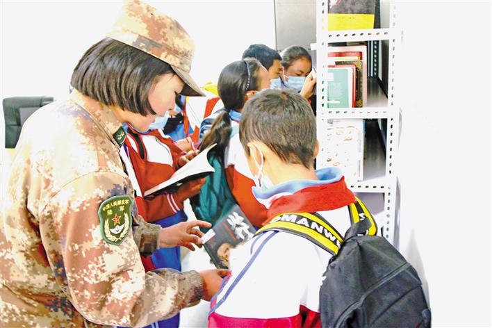 圖為部隊官兵在向學生介紹部隊圖書室藏書情況。段敏 攝