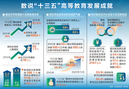 “我國(guó)已建成世界規(guī)模最大的高等教育體系?!眳菐r介紹,“十三五”期間,高等教育毛入學(xué)率不斷提升,由2015年的40%提高到2019年的51.6%,在學(xué)總?cè)藬?shù)達(dá)到4002萬(wàn)。