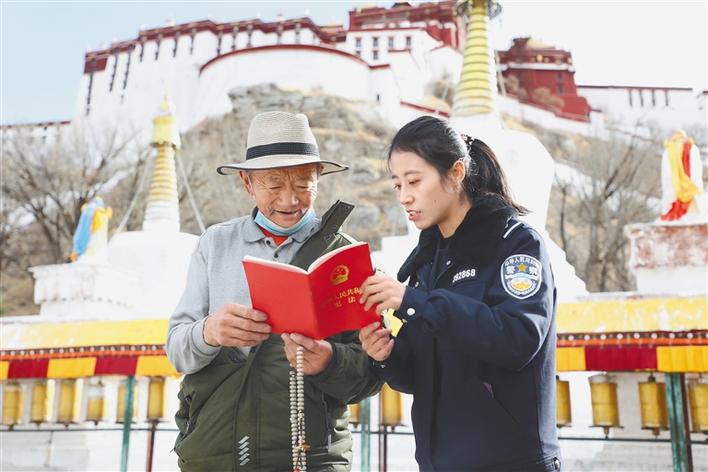 圖為西藏出入境邊防檢查總站執(zhí)法調(diào)查支隊(duì)民警在宗角祿康公園向過往群眾宣傳憲法知識。仁青旺堆 張一鳴 攝