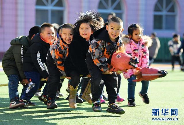 12月14日,河北省樂亭縣第三幼兒園的孩子們?cè)谕骝T竹馬游戲。新華社記者 牟宇 攝
