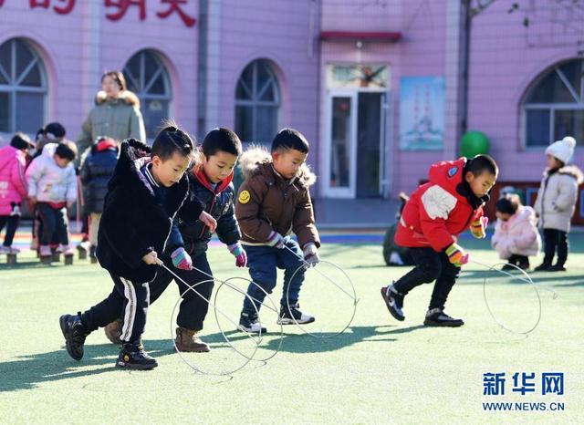 12月14日,河北省樂亭縣第三幼兒園的孩子們?cè)谕鏉L鐵環(huán)游戲。