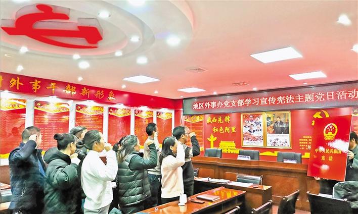 地區(qū)外事辦黨支部組織黨員干部在機(jī)關(guān)活動(dòng)場所舉辦學(xué)習(xí)宣傳憲法主題黨日活動(dòng)。