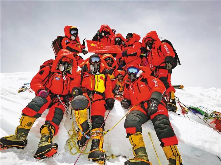 5月27日,2020珠峰高程測(cè)量登山隊(duì)成功登頂世界第一高峰珠穆朗瑪峰。他們?cè)诜屙斬Q立覘標(biāo),安裝GNSS天線(xiàn),開(kāi)展各項(xiàng)峰頂測(cè)量工作。45年前的這一天,中國(guó)人首次將覘標(biāo)帶至珠峰峰頂。新華社特約記者 扎西次仁 攝