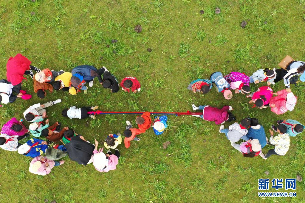 7月14日,河曲馬場(chǎng)小學(xué)的孩子們?cè)诓菰线M(jìn)行拔河比賽(無人機(jī)照片)。新華社記者 杜哲宇 攝