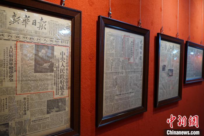 “這份最為寶貴,”索昂生格指著廊邊的第一幅相框,是《新華日報》1949年10月2日的報紙,頭版“中央人民政府宣告成立”大字醒目,“它見證了歷史?!?/p>