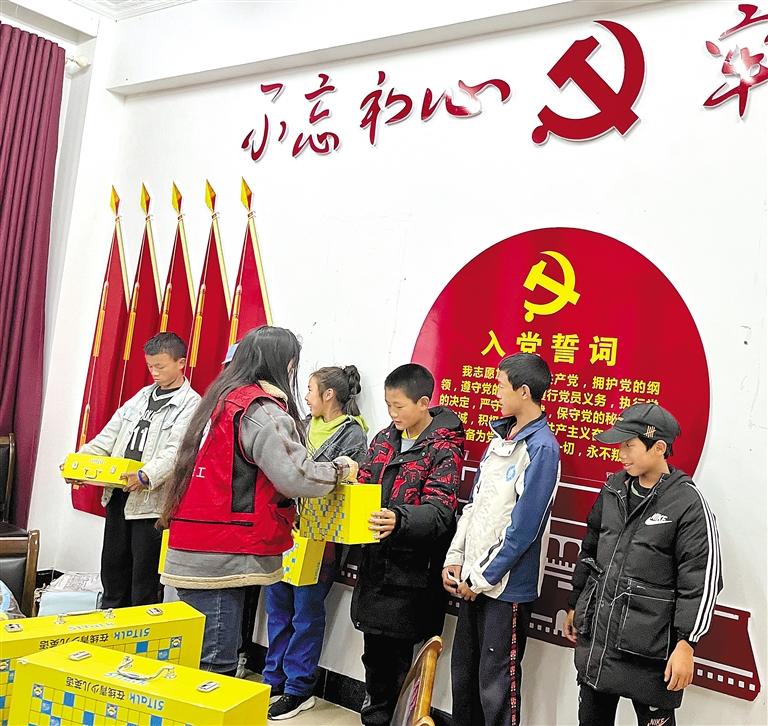圖為工作人員向事實(shí)無(wú)人撫養(yǎng)兒童發(fā)放圖書(shū)。記者 胡文 王珊 張猛 攝