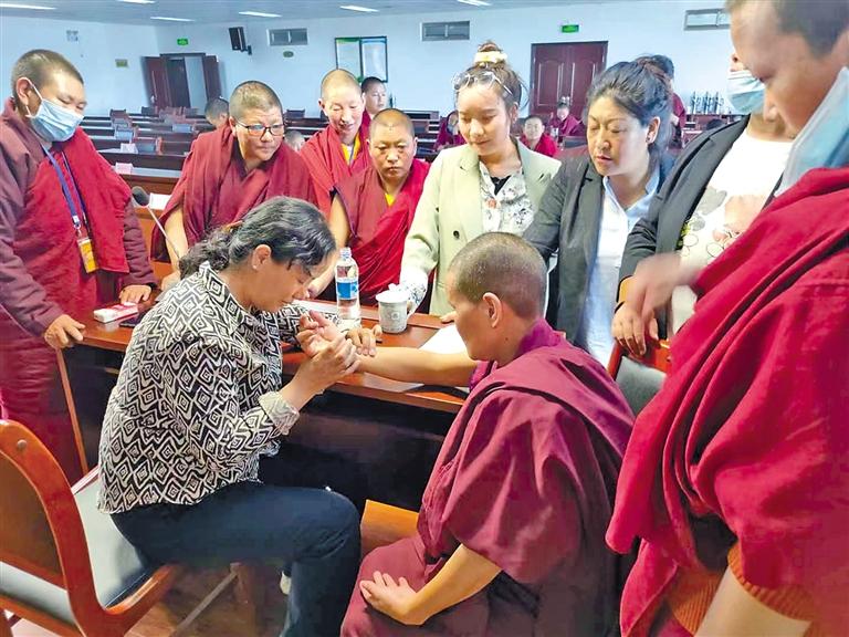 圖為明吉措姆教授在基層為僧尼群眾號脈。圖/文 本報記者 曉勇