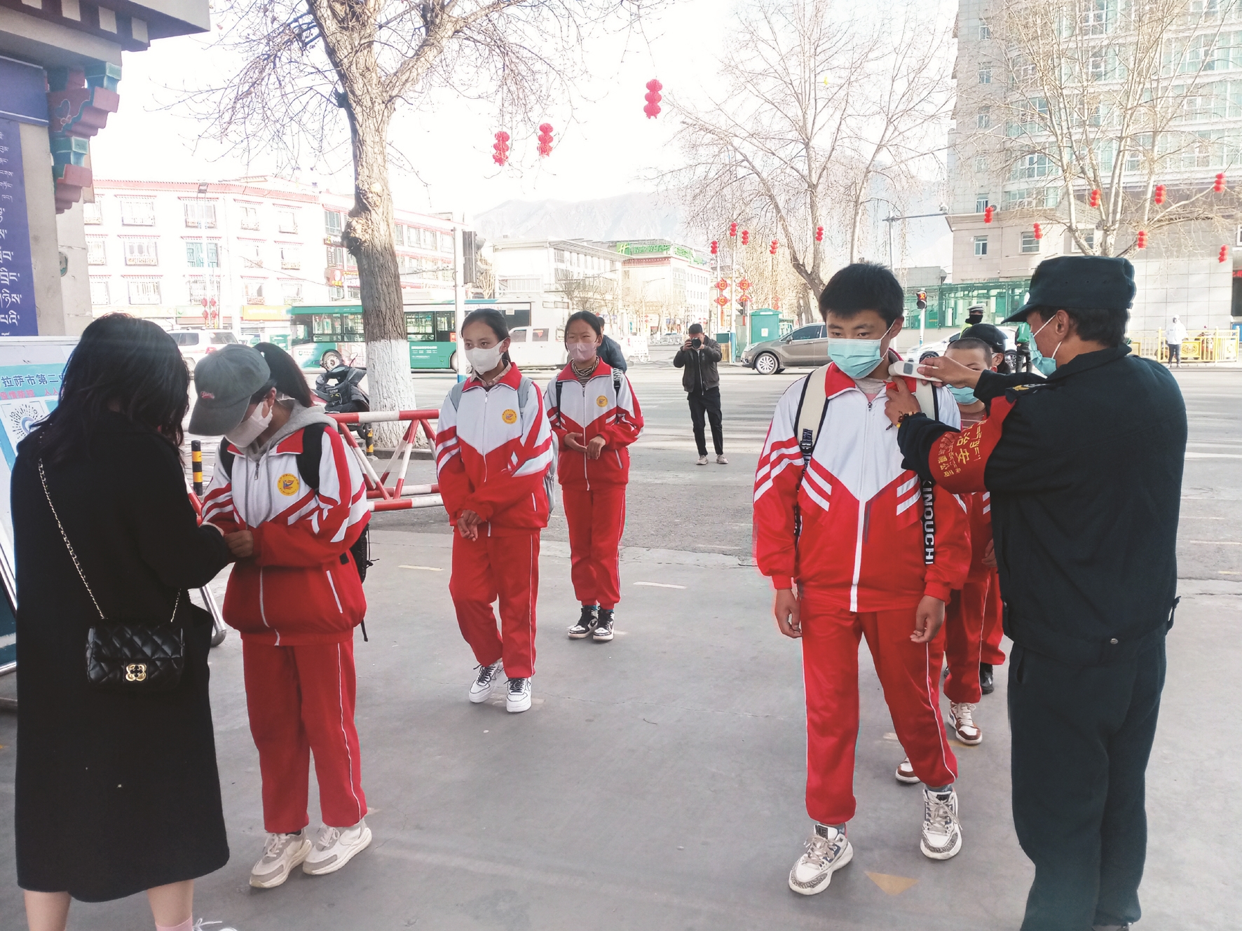 圖為市二中學(xué)生入校前接受體溫檢測(cè)。拉薩融媒記者 齊永昌攝