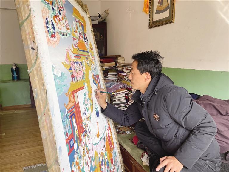國(guó)家級(jí)非物質(zhì)文化遺產(chǎn)藏族唐卡勉薩派自治區(qū)級(jí)代表性傳承人貢覺杰,是日喀則市拉孜縣若錯(cuò)勉沖唐卡世家的第五代傳承人。他自幼跟隨家族中的長(zhǎng)輩學(xué)習(xí)唐卡,如今已成長(zhǎng)為唐卡畫師中的“佼佼者”。藝無止境,是貢覺杰的堅(jiān)持。2016年,一次赴清華大學(xué)美術(shù)學(xué)院學(xué)習(xí)的偶然機(jī)會(huì),徹底改變了他的創(chuàng)作思路。今天,一起聽聽他和新題材唐卡的故事。文/圖 記者 趙越