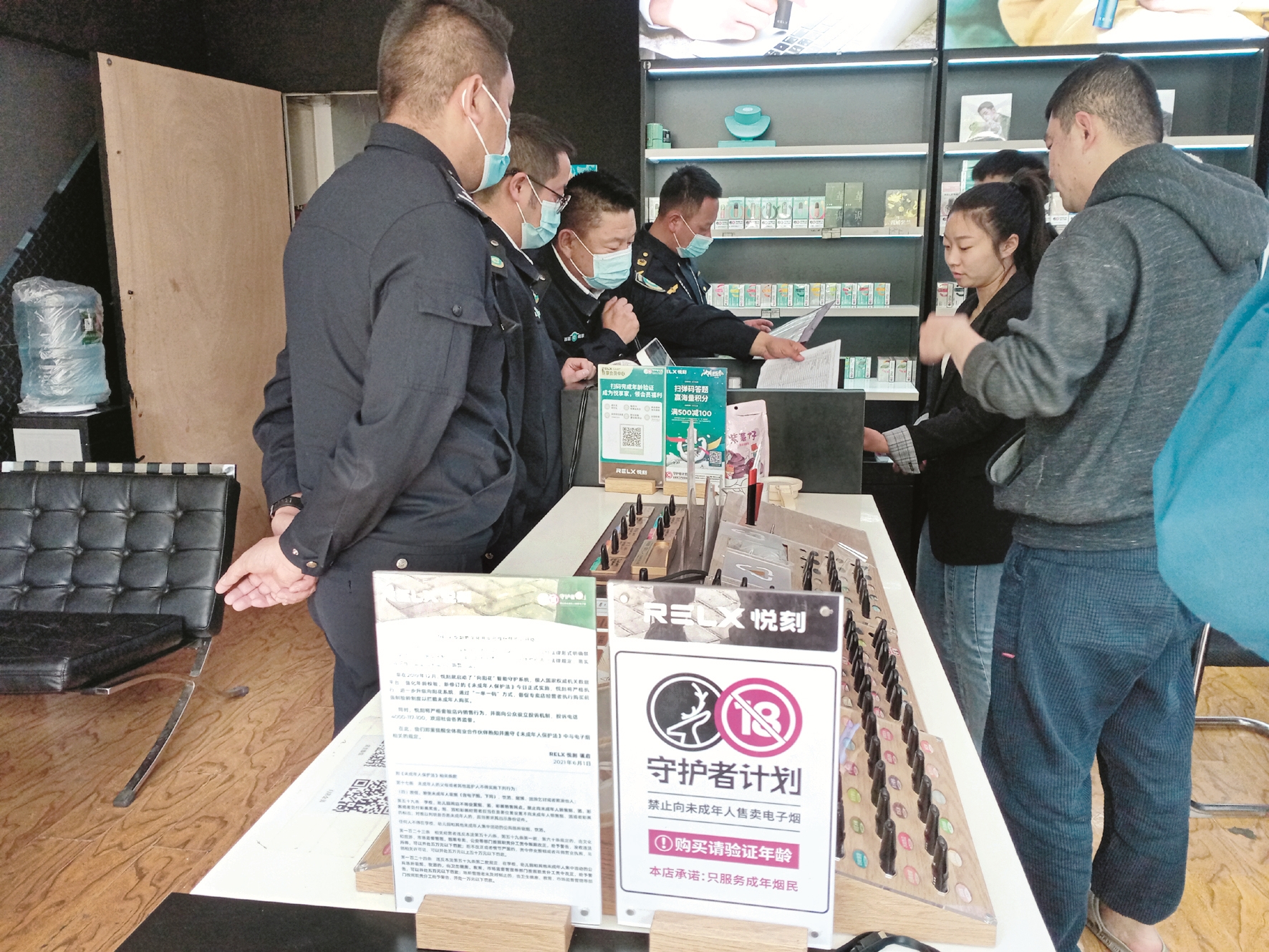 4月25日上午,市公安局和市煙草專賣局等四部門工作人員在柳梧新區(qū)聯(lián)合開展了電子煙銷售網(wǎng)點(diǎn)檢查。每到一個(gè)電子煙銷售網(wǎng)點(diǎn),執(zhí)法人員會詳細(xì)查看銷售網(wǎng)點(diǎn)是否具有相關(guān)經(jīng)營資質(zhì)、是否設(shè)立不得向未成年人售賣電子煙警示標(biāo)志以及身份證件核驗(yàn)等規(guī)定落實(shí)情況,并向電子煙經(jīng)營者進(jìn)行相關(guān)法律法規(guī)宣傳,告知經(jīng)營者嚴(yán)禁向未成年人銷售電子煙。