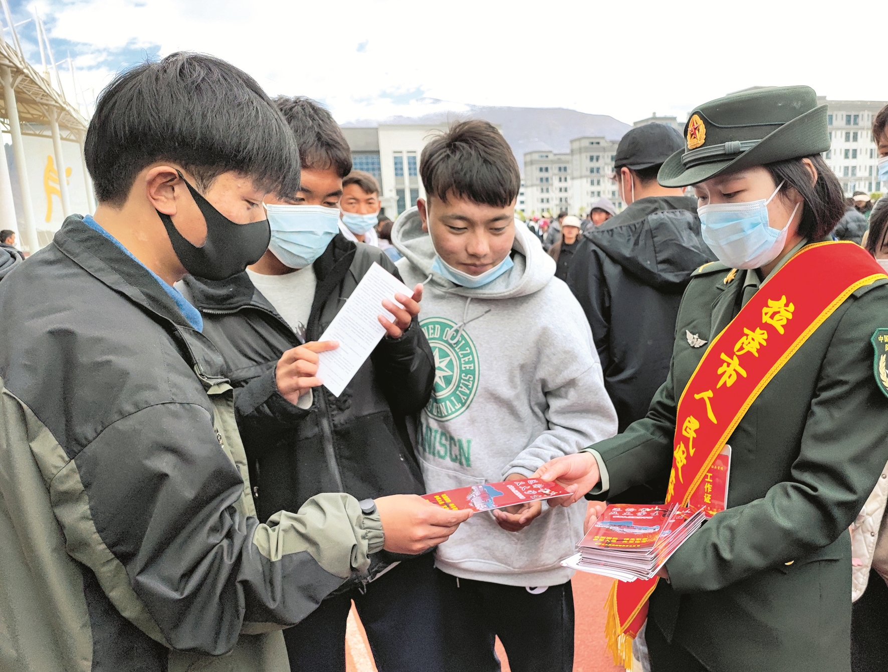 圖為市征兵辦工作人員向?qū)W生發(fā)放征兵宣傳資料。拉薩融媒記者 凃 瓊攝