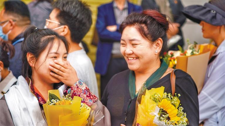 看到兒子從熙熙攘攘的人群中走出來,嘎瑪斯塔趕緊把花遞了上去,順便給了兒子尼瑪一個大大的擁抱?!鞍l(fā)揮得還行,應(yīng)該可以考進(jìn)理想的大學(xué)?!蹦岈斬Q起大拇指為自己點(diǎn)了一個贊。