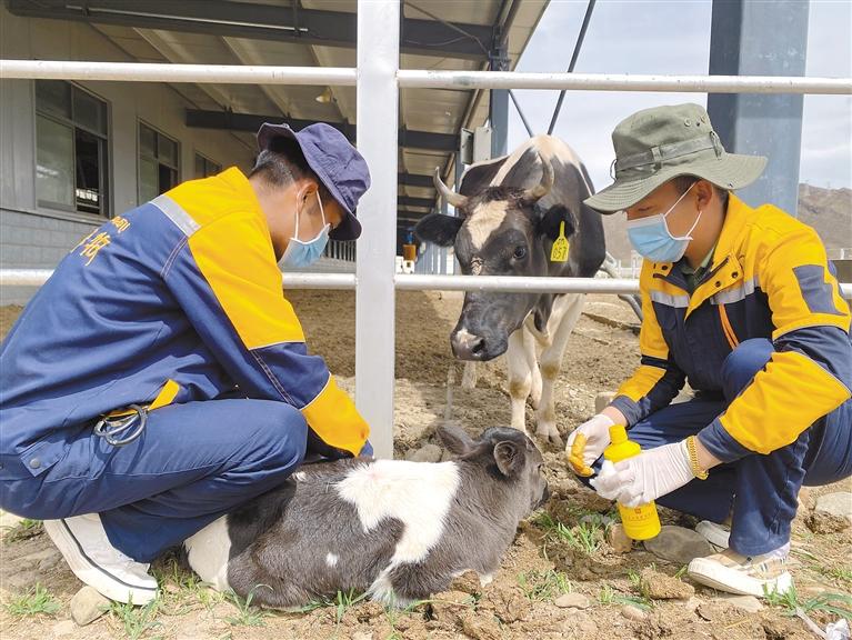 走進(jìn)格桑塘現(xiàn)代農(nóng)牧產(chǎn)業(yè)示范園,工作人員強(qiáng)久和土旦達(dá)杰嫻熟地在給小奶牛的肚臍消毒,這是他們工作3年時(shí)間順利接生的第43頭小奶牛。