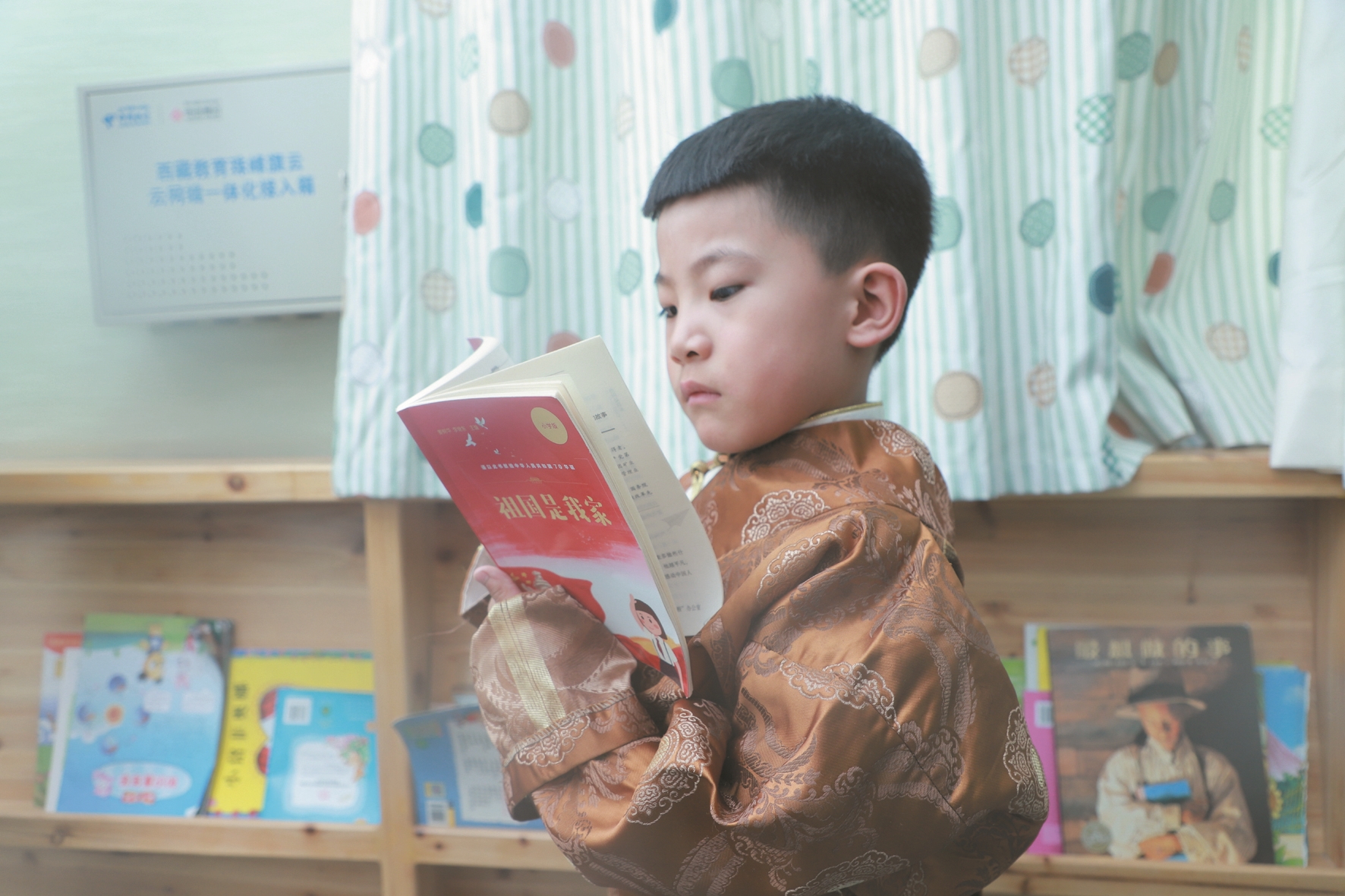 圖書館里,來自拉薩市江蘇實(shí)驗(yàn)幼兒園大五班的小朋友益西加措仔細(xì)地挑選著自己喜歡的書籍,只見他饒有興致地選中這本《祖國是我家》,并發(fā)現(xiàn)了書中“我在南京,我為中華之崛起而讀書”的卡片時(shí),他回應(yīng)道:“我在西藏,我為中華之崛起而讀書?!?/p>