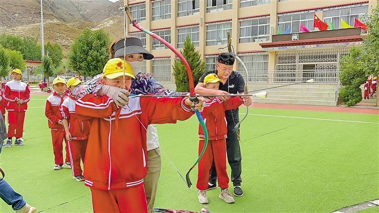 曲水縣達嘎鎮(zhèn)小學學生在體驗民族傳統(tǒng)體育項目響箭。
