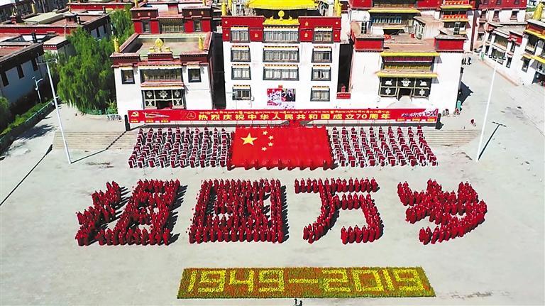 引導宗教界人士爭做愛黨愛國愛人民、堅決維護祖國統(tǒng)一和民族團結(jié)的模范。圖為2019年10月1日,西藏自治區(qū)昌都強巴林寺僧人以自己的方式表達對中華人民共和國成立70周年的祝福。