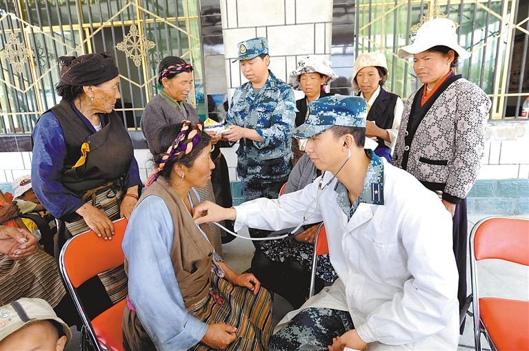 軍愛民、民擁軍,軍民團結(jié)一家親。圖為駐藏某部官兵為當?shù)厝罕娏x診。