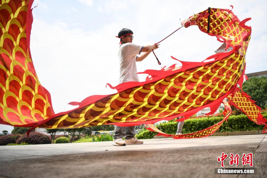 資料圖:低年級的學(xué)生為考生舞龍加油。 楊華峰 攝