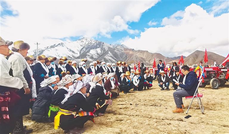 圖為宣講團(tuán)宣講員深入田間地頭為群眾講課。記者 格桑倫珠 裴聰 攝