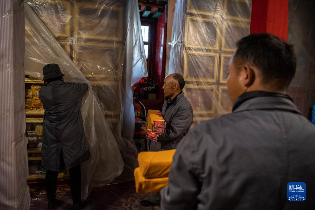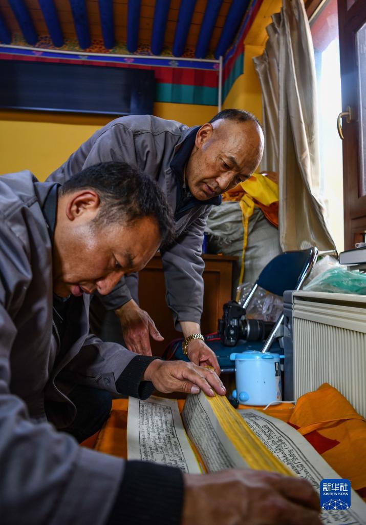 久米次成(左)與同事搬運(yùn)準(zhǔn)備進(jìn)行普查登記的古籍(4月19日攝)。新華社記者 晉美多吉 攝