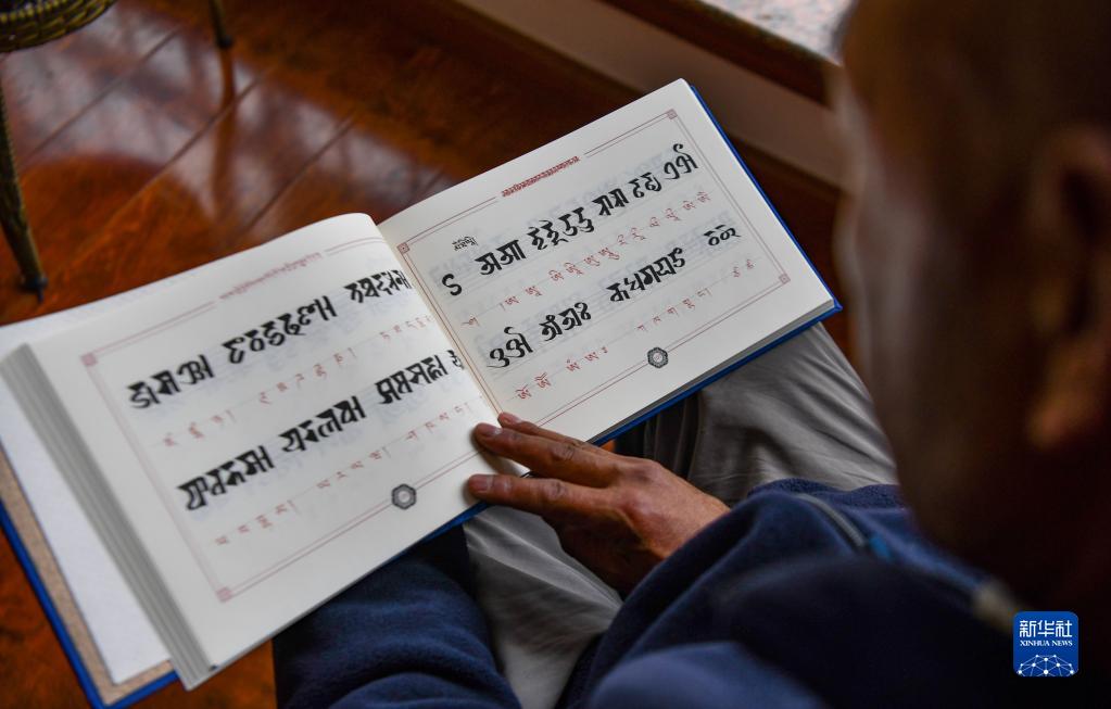 久米次成在家中撰寫梵文書法(4月19日攝)。新華社記者 晉美多吉 攝