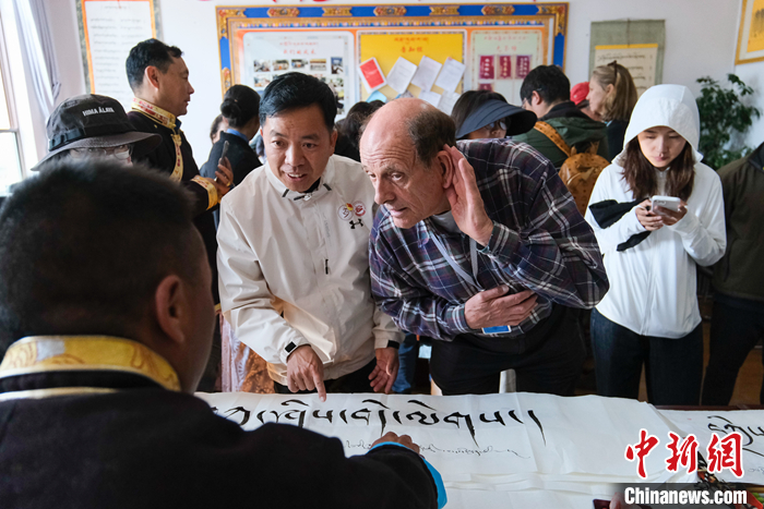 圖為5月18日上午,參訪團成員柯馬凱(Michael Crook)側耳傾聽藏文書法老師的講解。 中新社記者 江飛波 攝