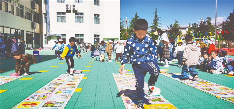 西藏軍區(qū)機關幼兒園兒童在做游戲——“紙杯運小球”。通訊員 白曲 攝