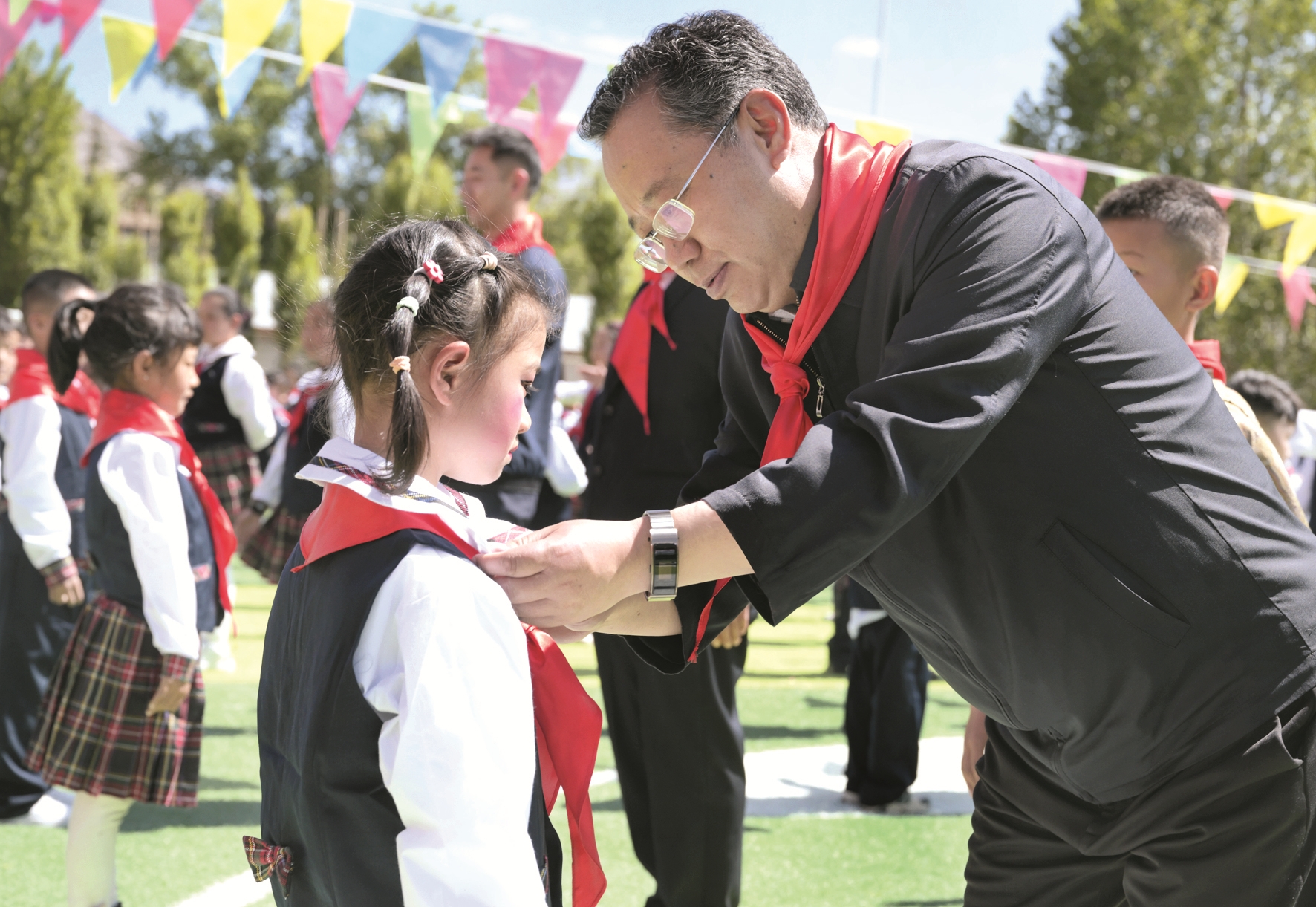 在市實(shí)驗小學(xué)門口,少年隊員們迎上前,為普布頓珠一行系上鮮艷的紅領(lǐng)巾。來到勞動教育基地,普布頓珠認(rèn)真了解勞動體驗課程有關(guān)情況,指出要充分發(fā)揮勞動教育樹德、增智、強(qiáng)體、育美的綜合價值,讓孩子們親近自然、樂于勞動,從小樹立“勞動光榮、勞動偉大”的觀念;參觀德育長廊時,指出教書育人、立德樹人,要倡導(dǎo)學(xué)生崇尚真善美,從小樹立正確的世界觀、人生觀、價值觀;綜合樓教室里孩子們正在進(jìn)行大合唱、民族舞才藝表演,普布頓珠對學(xué)校創(chuàng)新實(shí)施“1+X”課程給予肯定,為孩子們送上書籍等禮物,叮囑要加大孩子們的興趣、愛好和特長培養(yǎng),真正把素質(zhì)教育落到實(shí)處;操場上正在舉行少先隊員入隊儀式,普布頓珠為新入隊少先隊員系上紅領(lǐng)巾,勉勵孩子們奮發(fā)學(xué)習(xí)、全面發(fā)展,努力用實(shí)際行動為隊旗增光添彩。