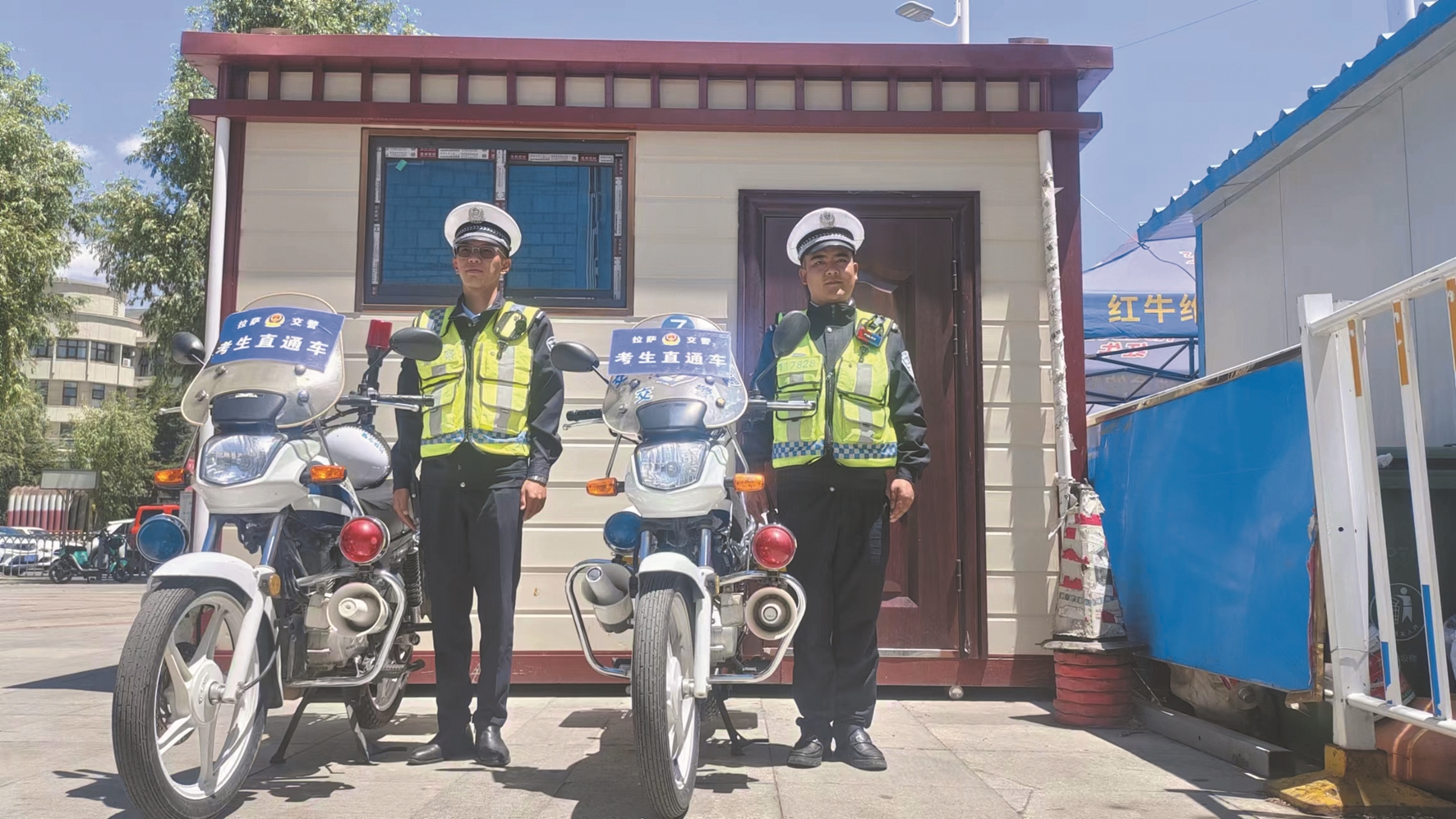 圖為6月6日上午,市公安局交警支隊城北大隊民警為警用摩托車貼好“考生直通車”標(biāo)識,整裝待發(fā)。拉薩融媒記者 齊永昌攝