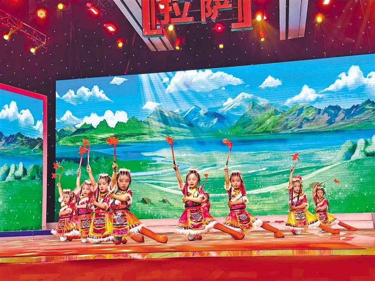 圖為拉薩市實(shí)驗(yàn)幼兒園東城分園的小朋友在表演舞蹈《歡樂(lè)的熱巴》。