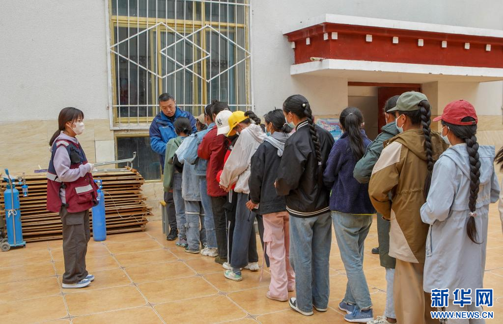 4日上午,在那曲市色尼區(qū)尼瑪鄉(xiāng)小學學生宿舍一樓大廳,學生們齊刷刷排成隊等待做心臟聽診。“聽診有問題的同學,由老師帶去做心臟彩超。”領(lǐng)隊醫(yī)生耿直一邊吸氧一邊聽診。