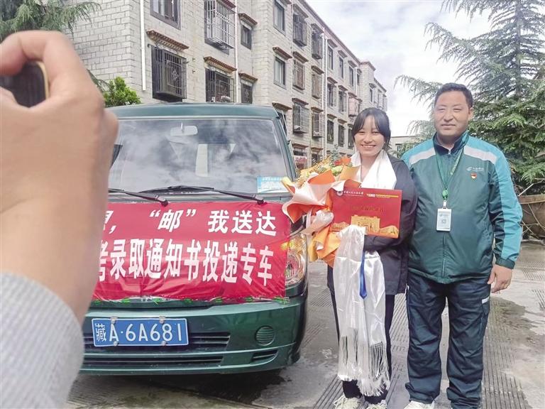 “喂,你好,請(qǐng)問(wèn)是白瑪玉珍同學(xué)嗎?我是拉薩郵政的,您有中國(guó)人民公安大學(xué)的錄取通知書,我們馬上要投遞了,請(qǐng)您準(zhǔn)備一下準(zhǔn)考證和身份證。”7月18日上午10時(shí)許,在投遞錄取通知書之前,中國(guó)郵政集團(tuán)有限公司拉薩市分公司教育城營(yíng)業(yè)部經(jīng)理吳金致電考生白瑪玉珍,讓她做好接收準(zhǔn)備。隨后,吳金駕駛一輛貼有“您的理想‘郵’我送達(dá)”橫幅的西藏郵政高考錄取通知書投遞專車出發(fā),前往白瑪玉珍家所在的扎基小區(qū)進(jìn)行投遞。來(lái)到白瑪玉珍家樓下,在仔細(xì)核對(duì)相關(guān)證件后,吳金將錄取通知書遞給白瑪玉珍。與此同時(shí),中國(guó)郵政集團(tuán)拉薩市分公司運(yùn)營(yíng)管理部經(jīng)理羅布次仁等人則為她獻(xiàn)上哈達(dá),送上祝福和鮮花。