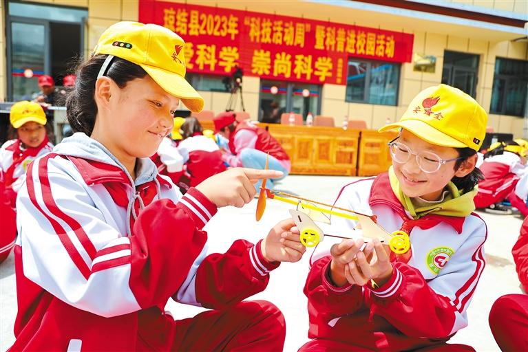 圖為瓊結(jié)縣拉玉鄉(xiāng)小學(xué)學(xué)生在對(duì)拼裝完成的橡皮筋動(dòng)力車(chē)進(jìn)行實(shí)驗(yàn)。(資料圖片)記者 白瑪澤旺 通訊員 倫珠澤仁 攝